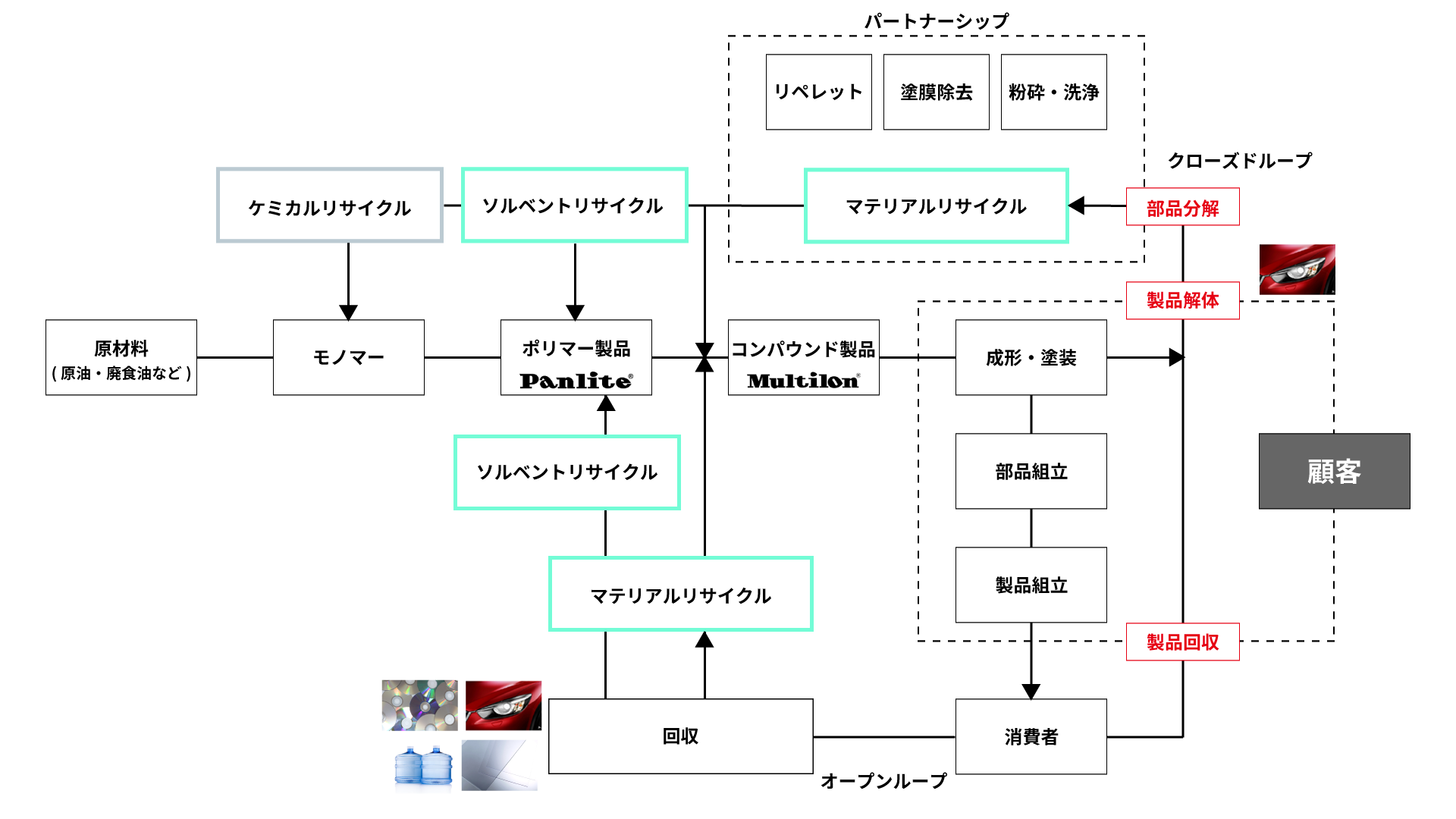 - 従来のオープンループによるマテリアルリサイクルのみならず、お客様及び帝人のパートナーと連携してクローズドループによるマテリアルリサイクルを推進します