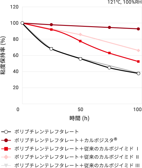 「カルボジスタ®」は、従来のカルボジイミド化合物と同様にポリエステル系、ポリアミド系、ポリウレタン、ポリ乳酸など幅広い汎用樹脂に対しても、それぞれの樹脂の性能を低下させることなく適用することができます。また、従来製品に比べて、より少量の添加で従来以上の高い耐加水分解性能を付与することが可能となります。
